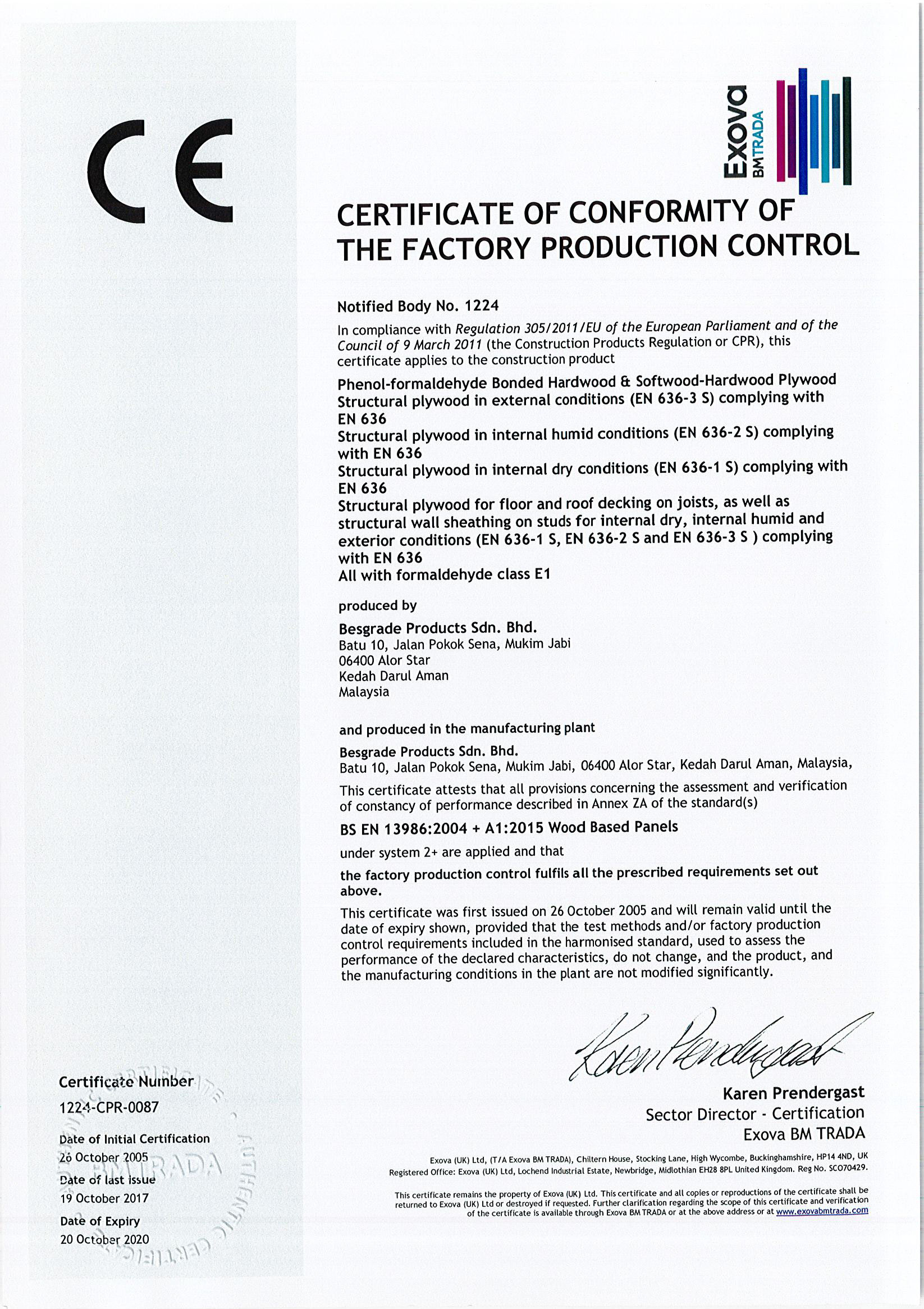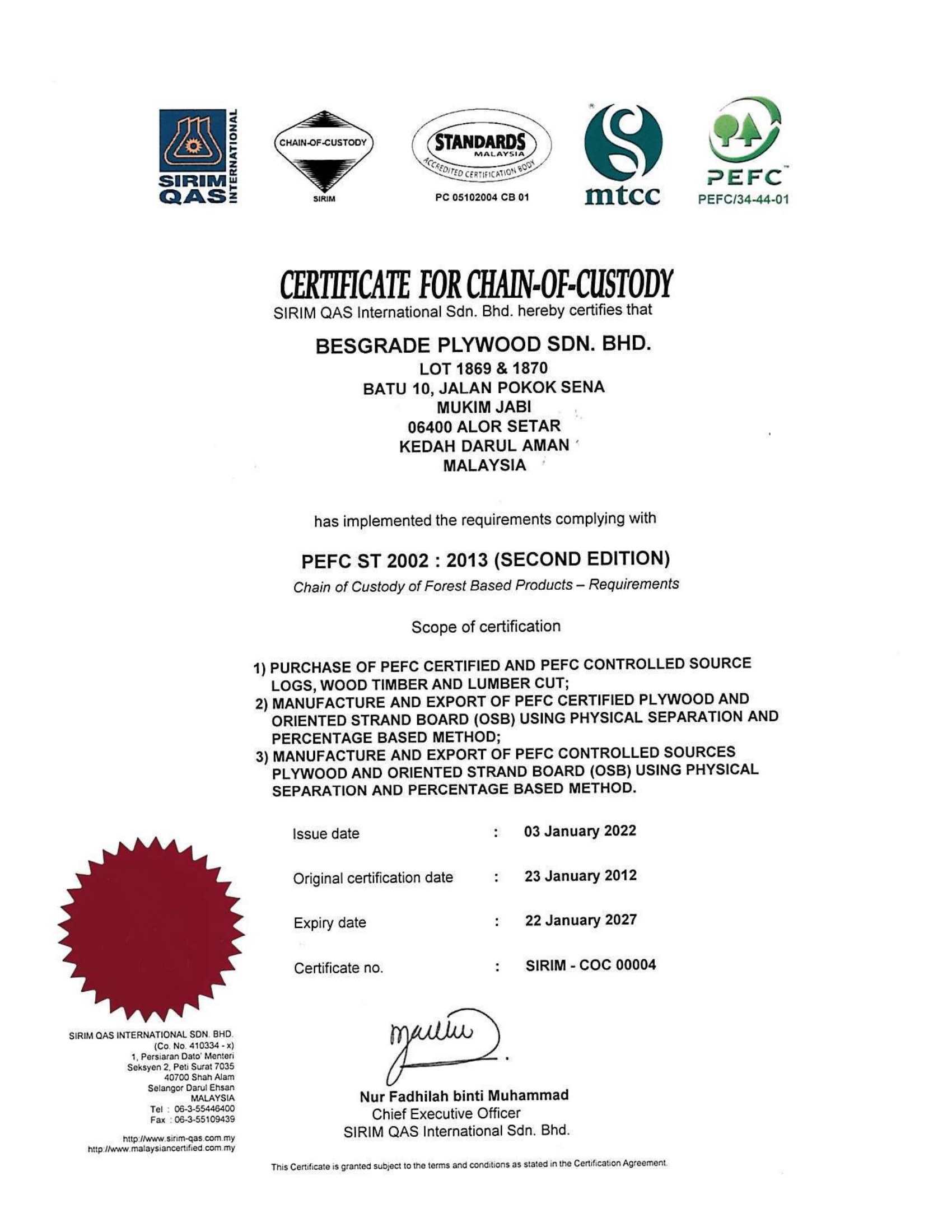 PEFC certification endorses that Besgrade Products procures material and manufactures products from sustainably managed forests. This certification is awarded based on adherence to internationally accepted intergovernmental conventions and guidelines.